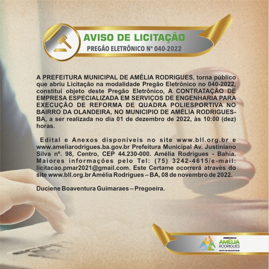 AVISO DE LICITAÇÃO PREGÃO ELETRÔNICO N º 040-2022   A PREFEITURA MUNICIPAL DE AMÉLIA RODRIGUES, torna público que abriu Licitação na modalidade Pregão Eletrônico no 040-2022, constitui objeto deste Pregão Eletrônico, A CONTRATAÇÃO DE EMPRESA ESPECIALIZADA EM SERVIÇOS DE ENGENHARIA PARA EXECUÇÃO DE REFORMA DE QUADRA POLIESPORTIVA NO BAIRRO DA OLANDEIRA, NO MUNICIPIO DE AMÉLIA RODRIGUES-BA, a ser realizada no dia 01 de dezembro de 2022, às 10:00 (dez) horas, Edital e Anexos disponíveis no site www.bll.org.br e www.ameliarodrigues.ba.gov.br Prefeitura Municipal Av. Justiniano Silva nº. 98, Centro, CEP 44.230-000. Amélia Rodrigues - Bahia. Maiores informações pelo Tel: (75) 3242-4615/e-mail: Este endereço de email está sendo protegido de spambots. Você precisa do JavaScript ativado para vê-lo.. Este Certame ocorrerá através do site www.bll.org.br Amélia Rodrigues – BA, 08 de novembro de 2022. Duciene Boaventura Guimaraes – Pregoeira.
