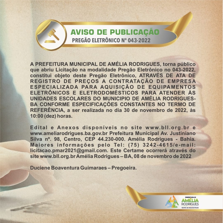 AVISO DE LICITAÇÃO PREGÃO ELETRÔNICO N º 043-2022 A PREFEITURA MUNICIPAL DE AMÉLIA RODRIGUES, torna público que abriu Licitação na modalidade Pregão Eletrônico no 043-2022, constitui objeto deste Pregão Eletrônico, ATRAVÉS DE ATA DE REGISTRO DE PREÇOS A CONTRATAÇÃO DE EMPRESA ESPECIALIZADA PARA AQUISIÇÃO DE EQUIPAMENTOS ELETRÔNICOS E ELETRODOMÉSTICOS PARA ATENDER ÀS UNIDADES ESCOLARES DO MUNICIPIO DE AMÉLIA RODRIGUES-BA CONFORME ESPECIFICAÇÕES CONSTANTES NO TERMO DE REFERÊNCIA, a ser realizada no dia 30 de novembro de 2022, às 10:00 (dez) horas, Edital e Anexos disponíveis no site www.bll.org.br e www.ameliarodrigues.ba.gov.br Prefeitura Municipal Av. Justiniano Silva nº. 98, Centro, CEP 44.230-000. Amélia Rodrigues - Bahia. Maiores informações pelo Tel: (75) 3242-4615/e-mail: Este endereço de email está sendo protegido de spambots. Você precisa do JavaScript ativado para vê-lo.. Este Certame ocorrerá através do site www.bll.org.br Amélia Rodrigues – BA, 08 de novembro de 2022. Duciene Boaventura Guimaraes – Pregoeira.