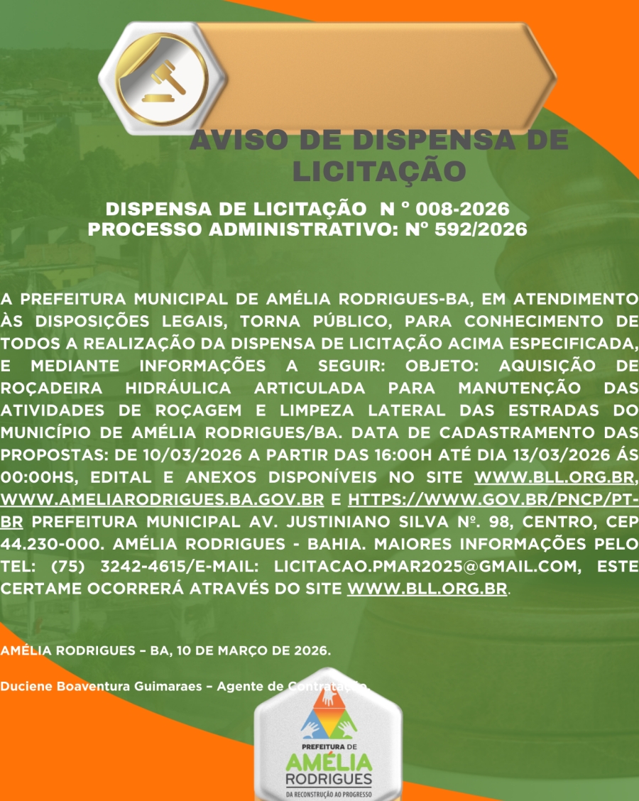- DISPENSA DE LICITAÇÃO Nº 008-2026 - PARA CONTRATAÇÃO DE EMPRESA ESPECIALIZADA PARA AQUISIÇÃO DE ROÇADEIRA HIDRÁULICA ARTICULADA PARA MANUTENÇÃO DAS ATIVIDADES DE ROÇAGEM E LIMPEZA LATERAL DAS ESTRADAS DO MUNICÍPIO DE AMÉLIA RODRIGUES/BA.